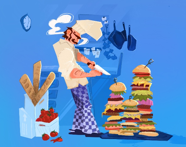 Ur really on to something here. it's like wobbly chef if it was fun. The careful pinpoint precision of inputs combined with the wacky unpredictability of the physics is as beautiful a combination as my sandwich of lettuce and onion that i served to a happy customer in the game. incredible artwork from ellie too and the music goes much harder than it should. good job team!!